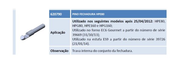 Aplicação Utilizado nos seguintes modelos após 25/04/2012: HPE80, HPG80, HPE160 e HPG160; Utilizado no forno EC6 Gourmet a partir do número de série 39669 (31/10/13); Utilizado na estufa ES9 a partir do número de série 39726 (21/01/14). Observação Trava interna do conjunto da fechadura.