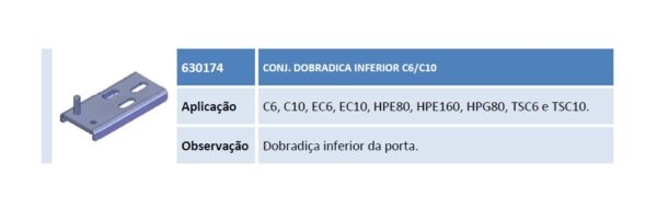 Aplicação C6, C10, EC6, EC10, HPE80, HPE160, HPG80, TSC6 e TSC10. Observação Dobradiça inferior da porta