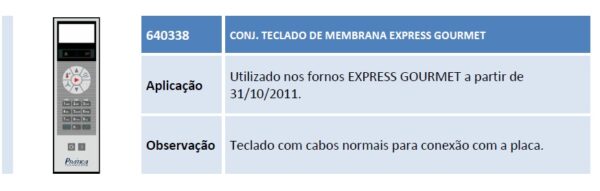 Aplicação Utilizado nos fornos EXPRESS GOURMET a partir de 31/10/2011. Observação Teclado com cabos normais para conexão com a placa.