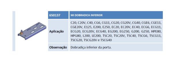 Aplicação C20, CG6, CG11, CG20, CGE11, CGE6, E125, E200, E250, EC20, ECG6, ECG11, EG200, EG250, G200, G250, HPG160, L200, LE200, TSC20, TSCG6, TSCG11, TSCG20 e TSCG40. Observação Dobradiça superior da porta.