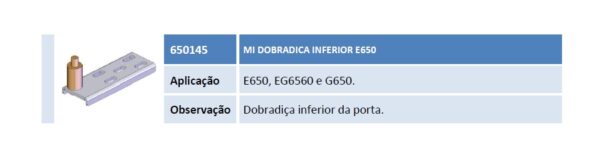 Aplicação E650, EG6560 e G650. Observação Dobradiça inferior da porta.