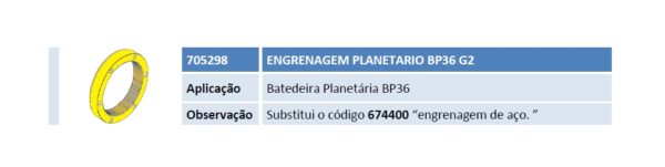 Aplicação Batedeira Planetária BP36 Observação Substitui o código 674400 “engrenagem de aço. ”