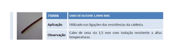 Aplicação Utilizado nas ligações das resistências da caldeira. Observação Cabo de uma via 1,5 mm com isolação resistente a altas temperaturas.
