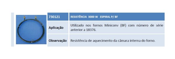 Aplicação Utilizado nos fornos Miniconv (BF) com número de série anterior a 18376. Observação Resistência de aquecimento da câmara interna do forno.
