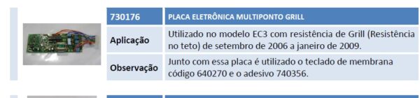 Aplicação Utilizado no modelo EC3 com resistência de Grill (Resistência no teto) de setembro de 2006 a janeiro de 2009. Observação Junto com essa placa é utilizado o teclado de membrana código 640270 e o adesivo 740356.