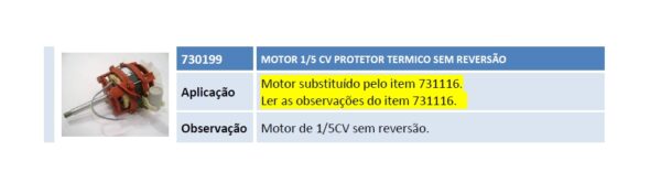 Aplicação Motor substituído pelo item 731116. Ler as observações do item 731116. 1 Observação Motor de 1/5CV sem reversão.