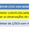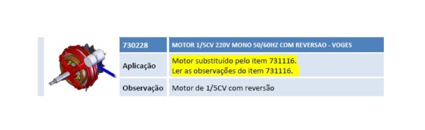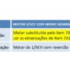 Aplicação Motor substituído pelo item 731116. Ler as observações do item 731116. 1 Observação Motor de 1/5CV com reversão