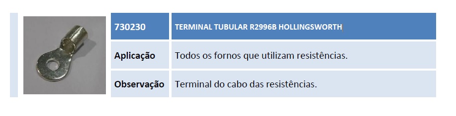 Aplicação Todos os fornos que utilizam resistências. Observação Terminal do cabo das resistências.