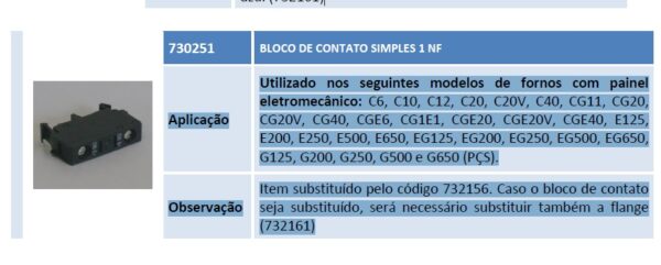 Aplicação Utilizado nos seguintes modelos de fornos com painel eletromecânico: C6, C10, C12, C20, C20V, C40, CG11, CG20, CG20V, CG40, CGE6, CG1E1, CGE20, CGE20V, CGE40, E125, E200, E250, E500, E650, EG125, EG200, EG250, EG500, EG650, G125, G200, G250, G500 e G650 (PÇS). Observação Item substituído pelo código 732156. Caso o bloco de contato seja substituído, será necessário substituir também a flange (732161)