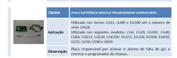 Aplicação Utilizado nos fornos CG11, G200 e EG200 até o número de série 33428. Utilizado nos seguintes modelos: CG6, CG20, CG20V, CG40, CGE6, CGE11, CGE20, CGE20V, EG125, EG250, EG500, EG650, G125, G250, G500 e G650. Observação Placa responsável por acionar o alarme de falta de gás e rearmar o programador de chamas.