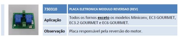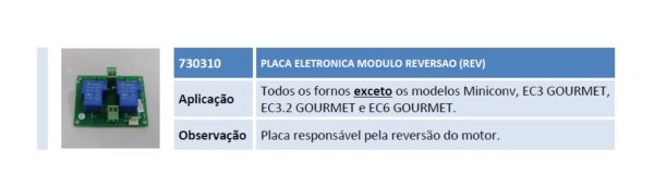 Aplicação Todos os fornos exceto os modelos Miniconv, EC3 GOURMET, EC3.2 GOURMET e EC6 GOURMET. Observação Placa responsável pela reversão do motor.