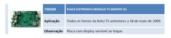 Aplicação Todos os fornos da linha TS anteriores a 18 de maio de 2009. Observação Placa com display sensível ao toque.
