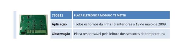 Aplicação Todos os fornos da linha TS anteriores a 18 de maio de 2009. Observação Placa responsável pela leitura dos sensores de temperatura.