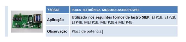 Aplicação Utilizado nos seguintes fornos de lastro SIEP: ETP1B, ETP2B, ETP4B, METP1B, METP2B e METP4B. Observação Placa de potência.