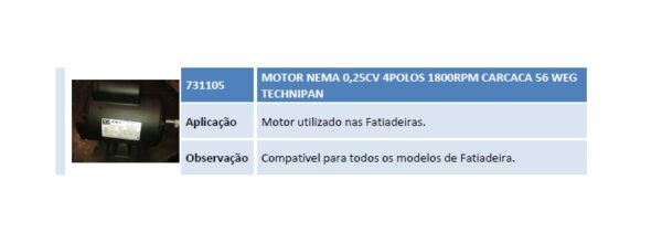 Aplicação E125, E200, E200BM, E250, L200, LE200, G200, G200BM, EG200, G250, EG250, E500, G500, EG500, E650, E650BM, G650, G650BM, EG650, C12, EC12, MC12, TSC12, C20, MC20, EC20, TSC20,CG6, ECG6, MCG6, TSCG6, CG11, CGE11,MCG11, TSCG11, CG20,CG20F, ECG20, TSCG20, MCG20, C20V, EC20V, TSC20V, CG20V,CGE20V, ECG20V, C40, TSC40, CG40, ECG40, TSCG40. Observação Motor de 1/2CV com reversão. Utilizado em fornos de Panificação a partir do número de série 35735 (data 25/02/2013). Utilizado em fornos Combinados a partir da data 06/03/2013. IMPORTANTE: nos fornos de fabricação anterior às datas acima, fabricados com o motor Voges ½ CV (730155) que precisarem da troca dos motores, deverá ser trocado o motor e os suportes pelo MI MOTOR 1/2 CV EIXO NORMAL WEG cód. 651302.