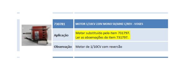 Aplicação Motor substituído pelo item 731797. Ler as observações do item 731797.1 Observação Motor de 1/10CV com reversão
