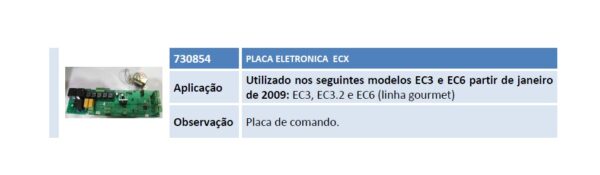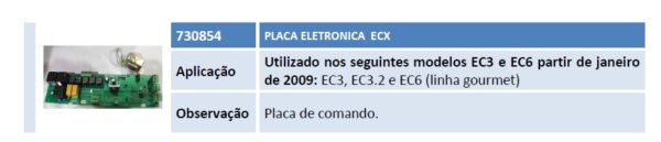 Aplicação Utilizado nos seguintes modelos EC3 e EC6 partir de janeiro de 2009: EC3, EC3.2 e EC6 (linha gourmet) Observação Placa de comando.
