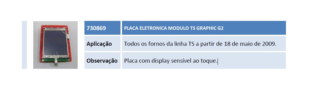 Aplicação Todos os fornos da linha TS a partir de 18 de maio de 2009. Observação Placa com display sensível ao toque.
