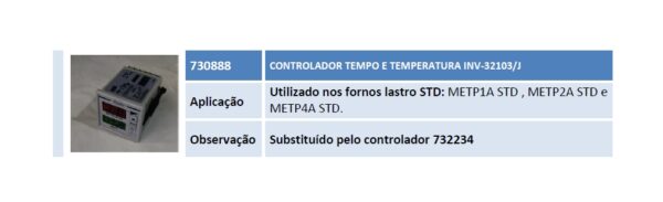 Aplicação Utilizado nos fornos lastro STD: METP1A STD , METP2A STD e METP4A STD. Observação Substituído pelo controlador 732234