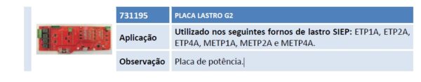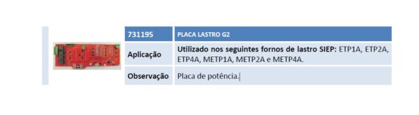 Aplicação Utilizado nos seguintes fornos de lastro SIEP: ETP1A, ETP2A, ETP4A, METP1A, METP2A e METP4A. Observação Placa de potência.