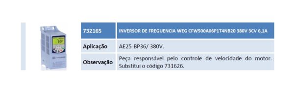 Aplicação AE25-BP36/ 380V. Observação Peça responsável pelo controle de velocidade do motor. Substitui o código 731626.