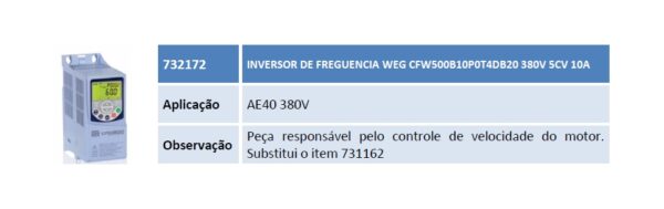 Aplicação AE40 380V Observação Peça responsável pelo controle de velocidade do motor. Substitui o item 731162