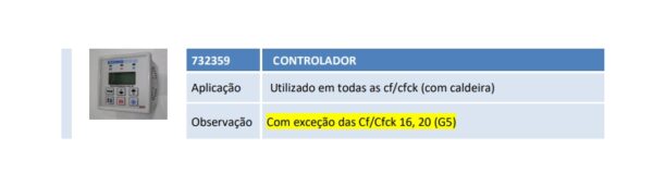 Aplicação Utilizado em todas as cf/cfck (com caldeira) Observação Com exceção das Cf/Cfck 16, 20 (G5)