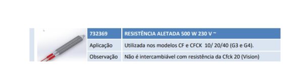 Aplicação Utilizada nos modelos CF e CFCK 10/ 20/40 (G3 e G4). Observação Não é intercambiável com resistência da Cfck 20 (Vision)