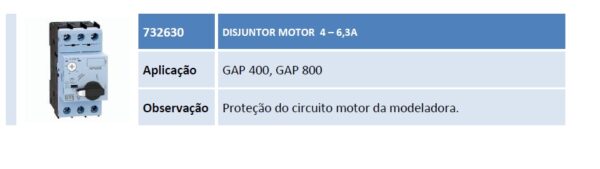 Aplicação GAP 400, GAP 800 Observação Proteção do circuito motor da modeladora.