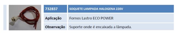 Aplicação Fornos Lastro ECO POWER Observação Suporte onde é encaixada a lâmpada.
