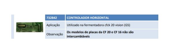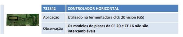 Aplicação Utilizado na fermentadora cfck 20 vision (G5) Observação Os modelos de placas da CF 20 e CF 16 não são intercambiáveis