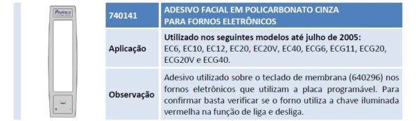 Aplicação Utilizado nos seguintes modelos até julho de 2005: EC6, EC10, EC12, EC20, EC20V, EC40, ECG6, ECG11, ECG20, ECG20V e ECG40. Observação Adesivo utilizado sobre o teclado de membrana (640296) nos fornos eletrônicos que utilizam a placa programável. Para confirmar basta verificar se o forno utiliza a chave iluminada vermelha na função de liga e desliga.