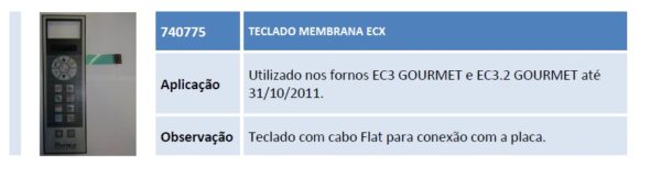 Aplicação Utilizado nos fornos EC3 GOURMET e EC3.2 GOURMET até 31/10/2011. Observação Teclado com cabo Flat para conexão com a placa.
