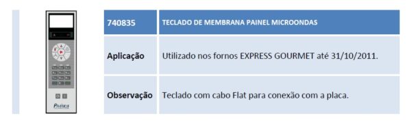Aplicação Utilizado nos fornos EXPRESS GOURMET até 31/10/2011. Observação Teclado com cabo Flat para conexão com a placa.