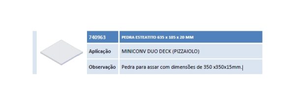 Aplicação MINICONV DUO DECK (PIZZAIOLO) Observação Pedra para assar com dimensões de 350 x350x15mm.