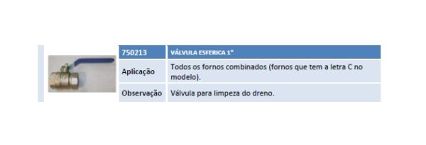 Aplicação Todos os fornos combinados (fornos que tem a letra C no modelo). Observação Válvula para limpeza do dreno