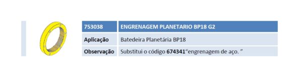 Aplicação Batedeira Planetária BP18 Observação Substitui o código 674341“engrenagem de aço. ”